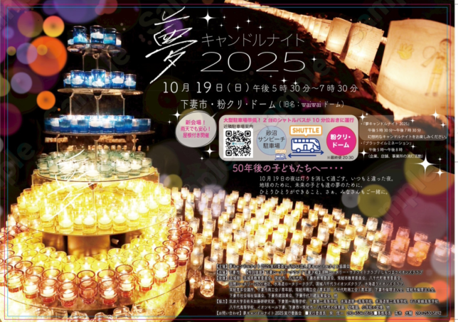 夢キャンドルナイト2025のホームページです! 10月19日(日) 午後5時30分 より下妻市・粉クリ・ドーム(旧名:waiwaiドーム)にて開催致します。 ~50年後の未来の子供たちのために~ 10月19日の夜は灯りを消して過ごす、いつもと違った夜。 地球のために、未来の子ども達の夢のために、そして、平和のために、 私達ひとりひとりができること。 さぁ、みなさんもご一緒に。 【後援団体】 【賛同人(企業・団体・個人)】